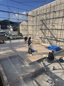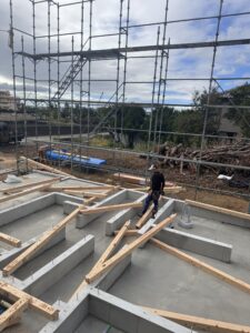 基礎コンクリートの上に土台や”大引き”を設置する重要な工程✍️