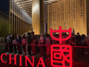 昼間が3時間待ちだった中国館も、中国語でスタッフの方に聞いてみると「1時間ぐらいで入れるよ~」と言われたので並んでみます。