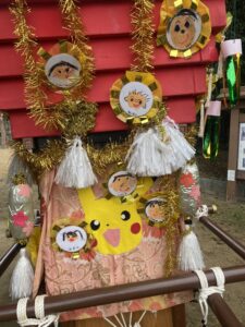 境内には自分たちの名前が書かれた似顔絵を貼った、こども太鼓(だんじり)が置かれています。
