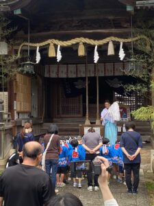 境内を何周かした後に、みんなで並んで太鼓の音に合わせて大きな掛け声を発します。