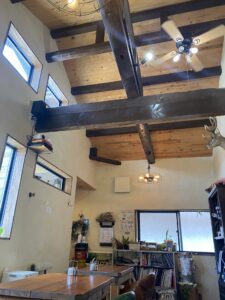 天井が高く梁が出ていたり、テーブルやイスなどアンティークな雰囲気があるからか、